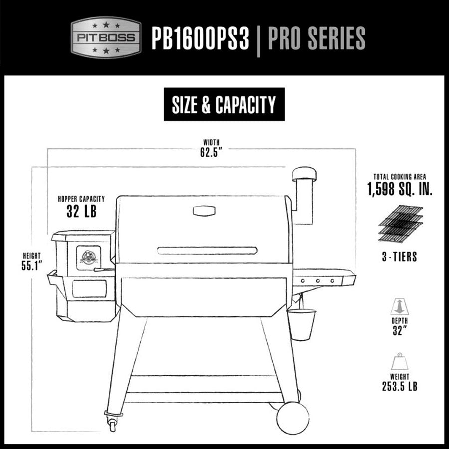 The PB1600PS3 comes equipped with a temperature range of 180° – 500°F. Fire it up and cook with indirect heat or use the Flame Broiler™ lever to direct flame sear up to 1,000°F. Additional features of the PB1600PS3 Wood Pellet Grill include a 32 lb. hopper capacity with an easy pellet cleanout door, removable ash management, straight grid porcelain coated cast iron cooking grates, a folding front shelf, solid side shelf with built-in tool hooks, 2 included meat probes and the Pit Boss 5-year warranty.