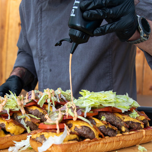 - Meat and onions should be ready, so remove from griddle and put onto our cutting board. Cut up our meat and place onions on a bowl. Now it is time to assemble. Start off by spreading avocado on our top bun with the cheese. Then let us start from the bottom bun, spread a layer of refried beans on bottom bun, then slices of meat, shredded iceberg lettuce, and then a couple slices of tomatoes